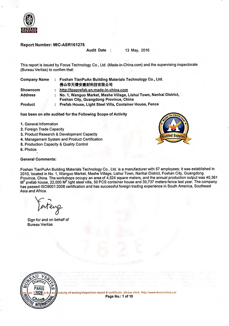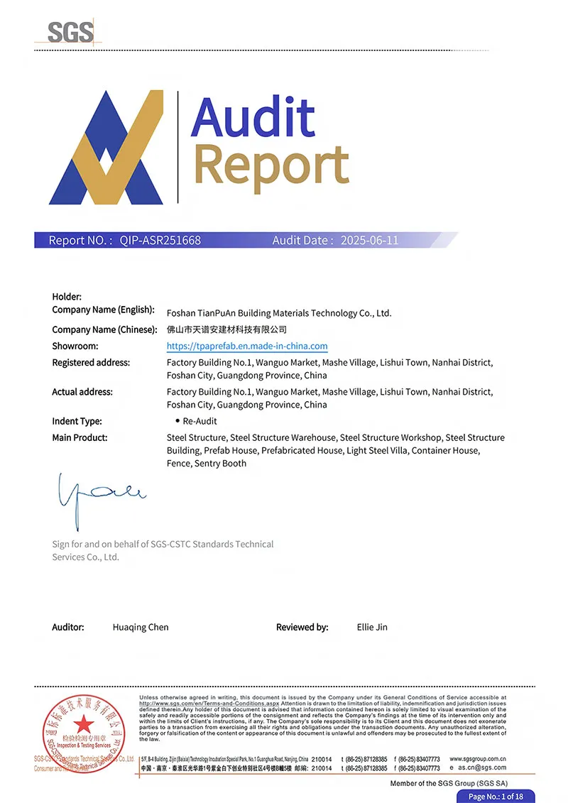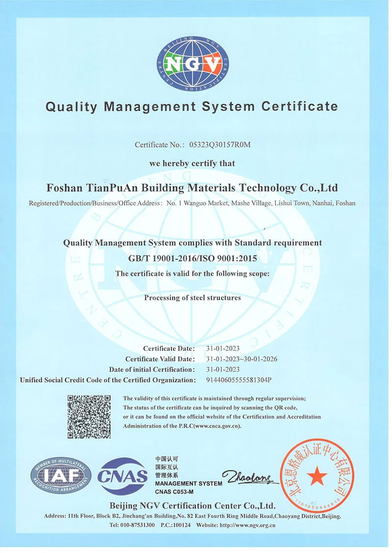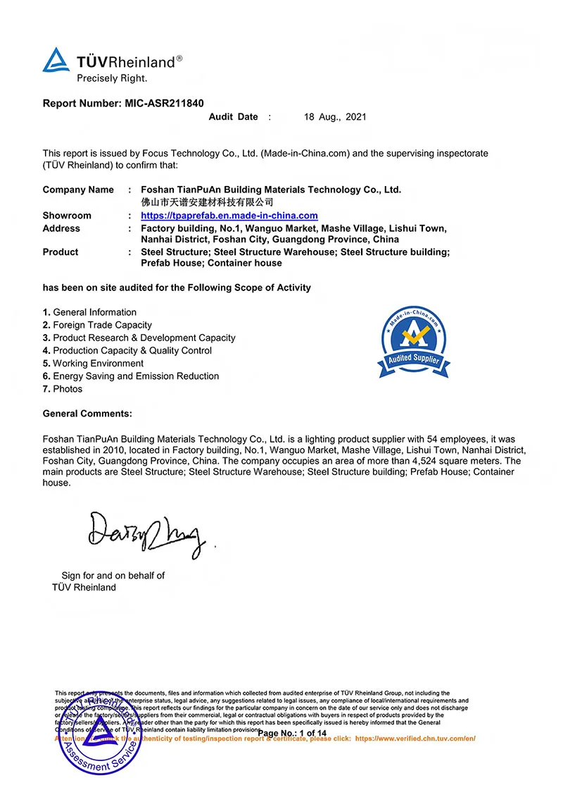 تأسست شركة Foshan TianPuAn building materials technology المعروفة اختصاراً (TPA Housing) في عام 2008، وتطورت لتصبح مزود شامل لحلول الهياكل الفولاذية، تشمل الاستشارات، التصميم حسب الطلب، التصنيع، التركيب في الموقع أو الإرشاد على التركيب، وإدارة المشاريع. متخصصون في تصنيع الهياكل الفولاذية، ورش الهياكل الفولاذية، والمباني الفولاذية المسبقة الصنع، ونقدم مجموعة كاملة من المنتجات لتلبية احتياجات مشروعك.